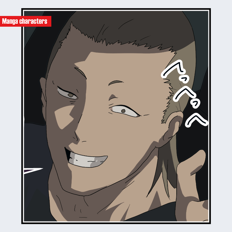 『チェンソーマン』に登場するヤクザは、剃り上げた頭部と細くつり上がった目が特徴で、表情は歯を見せた笑みと頬の影の強調によって輪郭が鋭く見える構造を持つ。鼻梁から口元にかけて浅い溝が描かれ、顔面の凹凸が明確に区分されている。衣装は暗色のスーツ系上着が視認範囲にあり、襟元の構造が簡略化されている。全体として「人型写実系」の造形で、特定の装飾パーツは少なく、顔面の形状が主要な識別要素となっている。