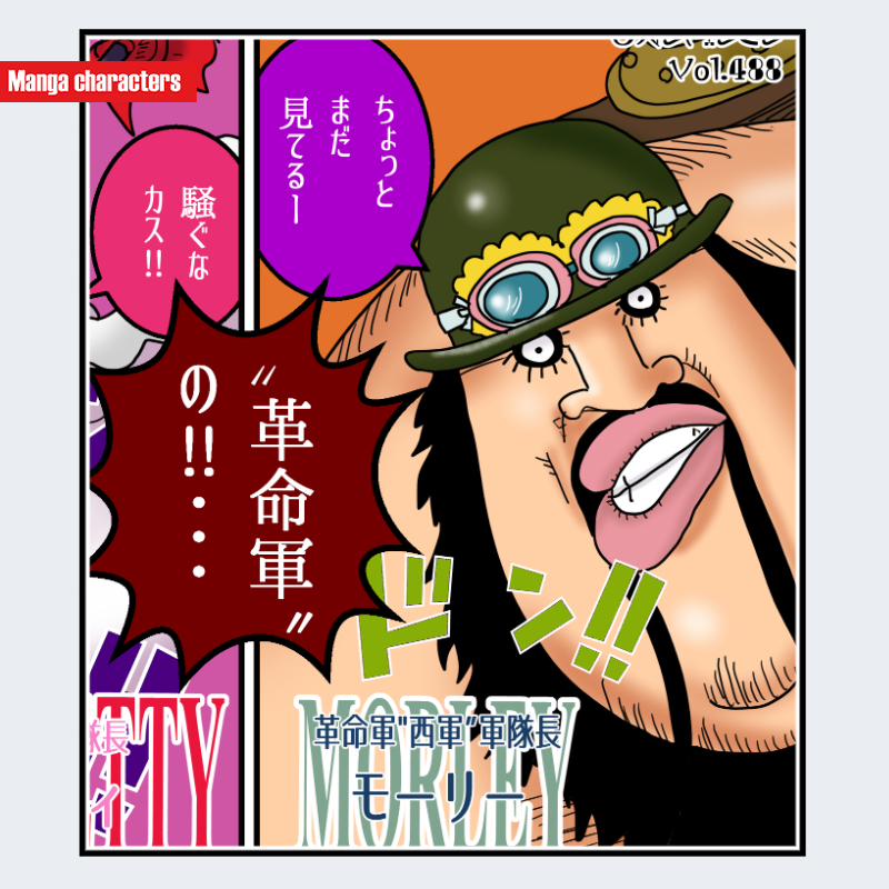 『ONE PIECE』に登場するモーリーは、上半身の視認情報から、特徴的な口元と装備的アクセサリを併せ持つ「装具軽装型」の構造を持つキャラクターである。頭部にはゴーグル付きの帽子が乗り、額から後頭部にかけて湾曲する形状が確認できる。口元は非常に大きく開く独特の造形で、頬から顎にかけて太い線が強調されている。首元にはスカーフまたは布状の装飾が結ばれ、衣装全体は軽装の作業服に近い構造を取っている。可視範囲は上半身のみであるが、革命軍キャラ特有の機能的装備が視覚的特徴として示されている。