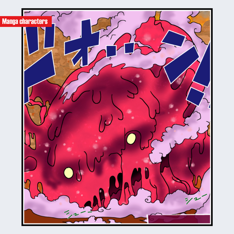 『ONE PIECE』に登場するスマイリーは、上半身の視認情報から、粘液状の不定形ボディを主体とする「液状体構造型」のキャラクターである。全体は赤紫色の半透明質感で描かれ、輪郭線が一定せず流動的に波打つ形状が特徴的である。目は黄色の発光点として浮かび上がり、固体的な瞼や輪郭を持たない。身体表面には滴下する粘性の表現が多数入り、上方から下方へ垂れ流れるような層が形成されている。同作品内の動物系や人型キャラと異なり、身体の骨格・衣装・髪といった要素が一切存在しない点が最大の識別ポイントである。