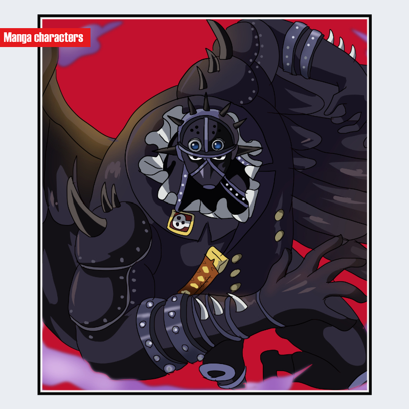 『ONE PIECE』に登場するキングは、上半身の視認情報から、黒一色の重装外殻と仮面状ヘッドギアを併せ持つ「重装外殻型」の構造を持つキャラクターである。頭部は金属的意匠を備えた黒い覆面で完全に覆われ、目・鼻・口の輪郭が隠されている。胸部と肩部は鋲や装甲板を用いた黒の重衣装で構成され、その上から翼状の外殻が後方へ大きく展開する。各部には鋲・金具・ベルトが多層的に配置され、黒一色の中でも質感の差が強調されている。同作品内の他キャラには見られない、仮面+翼+全身黒装甲の三要素が識別軸となる。