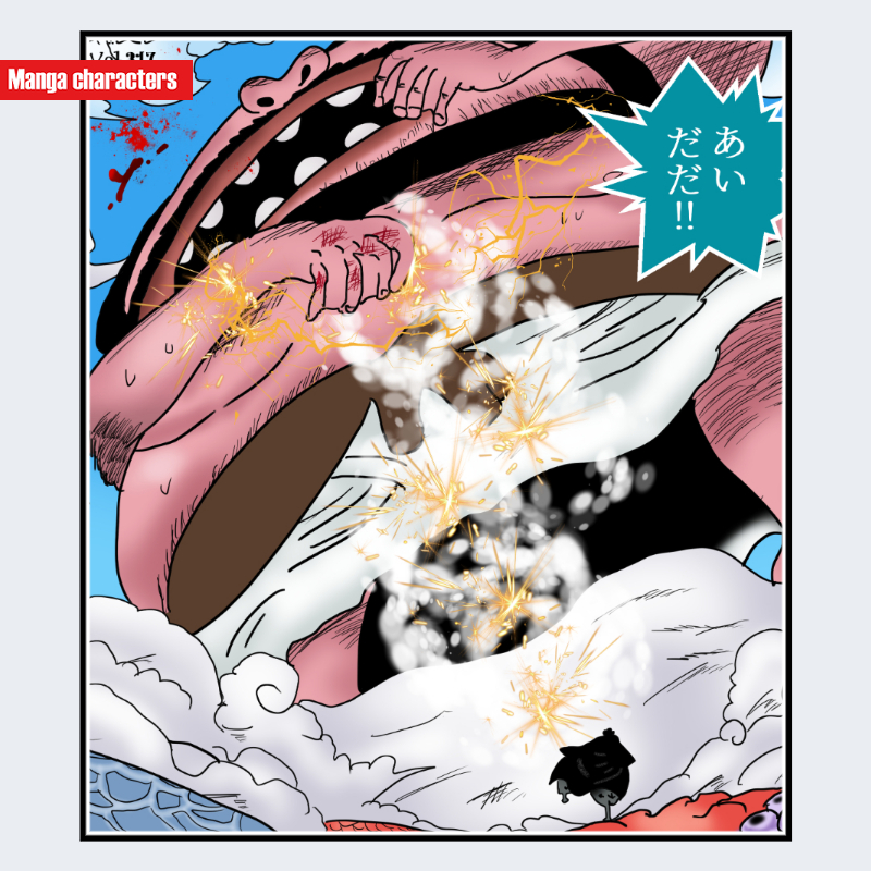 『ONE PIECE』に登場するワダツミは、上半身の視認情報から、巨大な体表と魚人特有の輪郭を持つ「巨体魚人型」の構造を持つキャラクターである。頭部は丸みが強く、額から後頭部にかけて黒い帯状の毛が縁取る形状となっている。大きく開いた口には多数の歯が並び、上下とも丸みのある歯列が特徴的である。胸部から腹部にかけては淡い桃色の皮膚が広がり、体毛のような細かい線描が散見される。腰には布を結んだ簡素な衣装をまとっており、同作品内の他の魚人キャラと比較しても特に巨体が際立つ構造に属する。