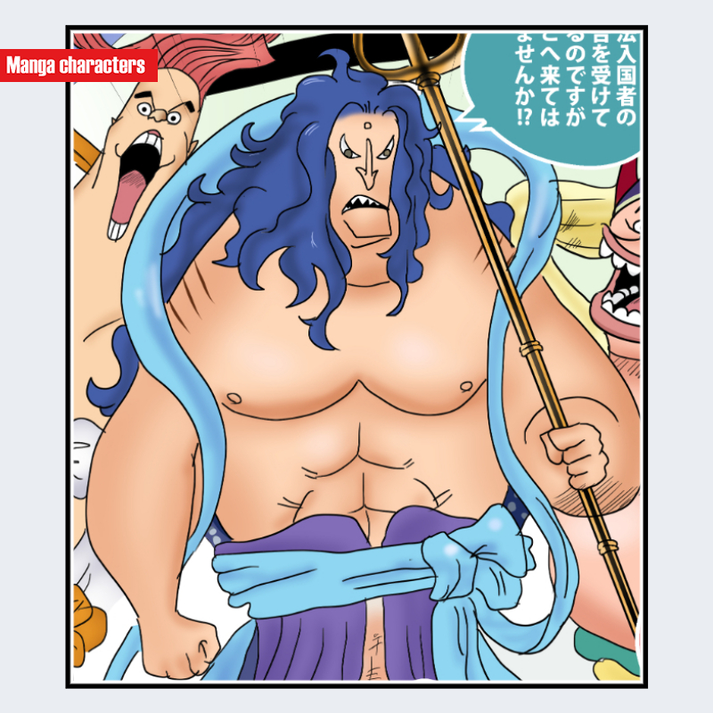 『ONE PIECE』に登場するフカボシは、上半身の視認情報から、魚人特有の体表構造と武装要素を併せ持つ「武装魚人型」の構造を持つキャラクターである。髪は濃い青色で長く波打つ形状をとり、肩から胸元へ垂れる量感のある構成になっている。胸部は筋線が強調された人型に近い体格だが、側面にかけて滑らかな魚人特有の体表線が確認できる。下半身に続く腰布は青系の布を結んだ装束で、武器として長い槍を保持し、上半身のシルエットを縦方向に伸ばす視覚要素となっている。同作品内の魚人王族系キャラと比較すると、波状の青髪と引き締まった体格が識別点となる。