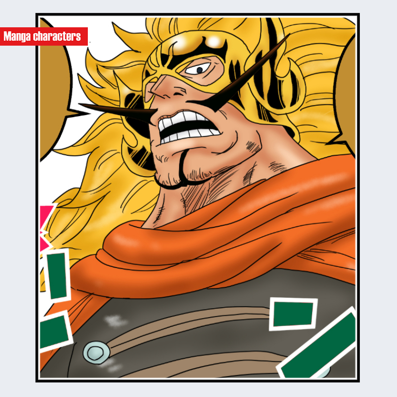 『ONE PIECE』に登場するヴィンスモーク・ジャッジは、上半身の視認情報から、金属質マスクと長髪装束を併せ持つ「装甲指揮型」の構造を持つキャラクターである。髪は黄金色で量感が大きく、後方から左右へ波状に広がる形で描かれている。顔面には金属質のマスクと黒いライン装飾が施され、頬から顎にかけて伸びる黒色の髭状デザインが特徴的である。首元にはオレンジ色の太いスカーフが重ね巻きされ、胸元から肩にかけてのシルエットが強調されている。上半身全体が硬質的な輪郭で統一され、同作品内の科学系キャラらしい造形バランスを持つ。