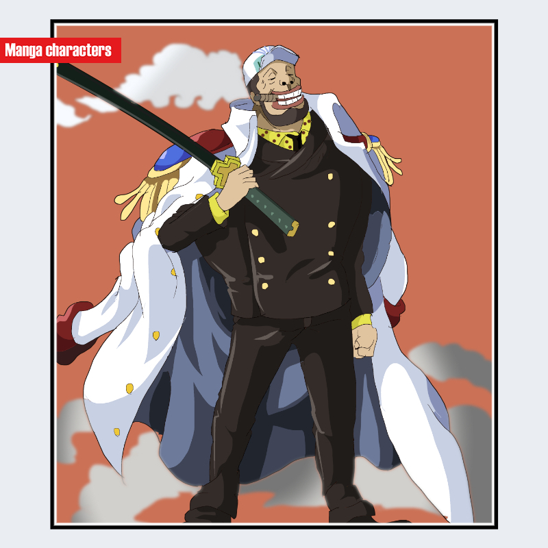 『ONE PIECE』に登場するやまかじは、海軍将校の典型的な「軍装戦闘型」の視覚構造を示すキャラクターである。頭部は海軍制帽の上に白布を巻いた独自の装いで、頬の無精髭や笑みを含んだ表情が輪郭を強調している。上半身は黒を基調とした二重ボタンの軍服で、襟元と袖口に黄色の差し色が入り、胸部全体が縦長のシルエットで描かれている。肩には海軍コートを掛け、金房飾りのエポレットが左右に配置されている。右手には長刀を保持し、鞘と柄の色分けが明確で、装備の直線形状が軍服の硬質感と揃っている。