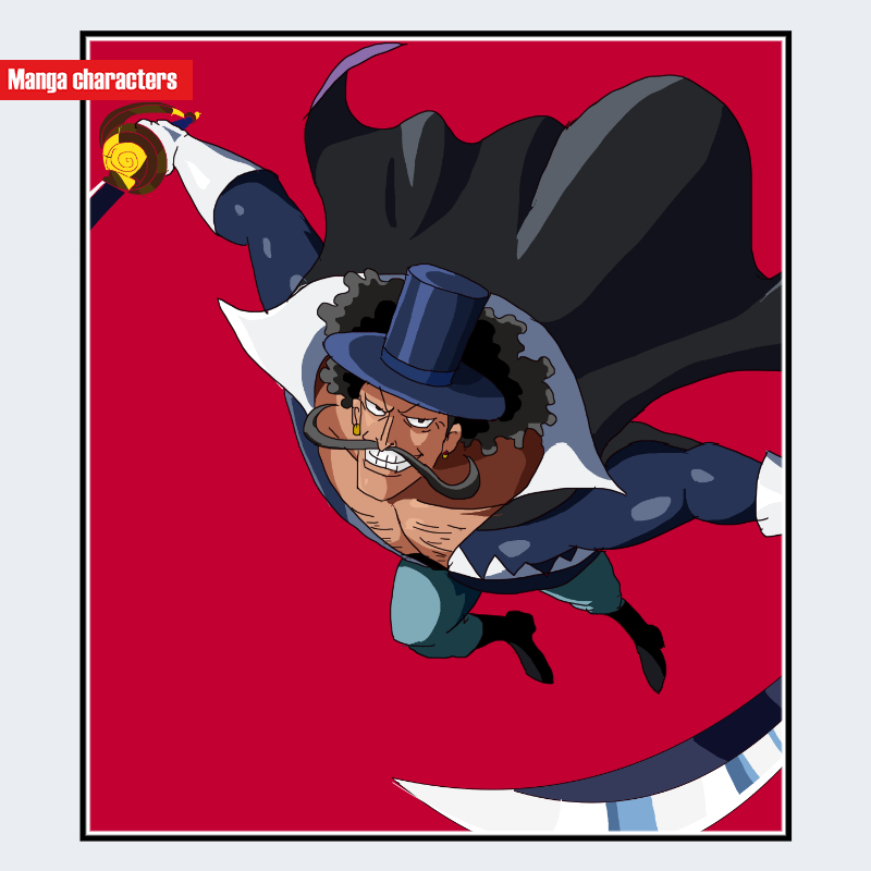 『ONE PIECE』に登場するビスタは、大きく湾曲した口髭とトップハットが目を引く独特の外観を持つ。長い巻き髪が肩付近まで流れ、上半身は胸元を大きく露出した衣装で、両肩からマント状の外装が広がる「外套装飾型」の構造が形成されている。帽子とマントの組み合わせは同作のシャンクスとは異なり、フォーマル寄りのシルエットが強調される点で差別化されている。視認範囲では、青系の袖口や白い縁取りが衣装構造の境界として機能し、全体として「上層外装構造」を持つ造形が確認できる。
