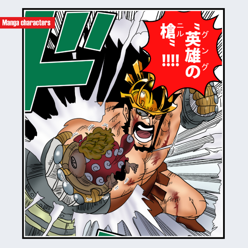 『ONE PIECE』に登場するハイルディンは、非常に大柄な体格と、頭部を覆う金色の角冠が象徴的な造形を持つ。長い金髪と口髭が顎から大きく広がり、胸元は裸で、肩と背面には大型の白いマントが重層的に展開する「外骨格外套型」の視覚構造に属する。腕部には布巻きが施され、筋肉量を強調する分割ラインが露出している。同作の巨人族キャラに共通する大スケールの外観を共有しつつ、角冠とマントの組み合わせが固有の階層構造を形成している。