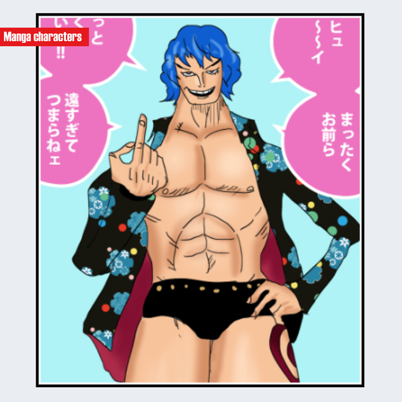 『ONE PIECE』に登場するブルーギリーは、鮮やかな青髪と、肩から袖にかけて花柄が散りばめられた外装を持つ人物として描かれている。髪は波打つ形状で、額に向けて前髪が鋭く落ちる構造を形成している。上半身は大きく露出しており、胸部から腹部の縦ラインが強調される「露出外装型」の造形に属する。花柄外装は黒地の布に重ねる形で配置されており、同作のキンエモンなどの和装系外観とは異なり、西洋的なコートに近い開放構造となっている。指先のポーズも含め、腕まわりの大きな可動域が視覚情報として強調されている。