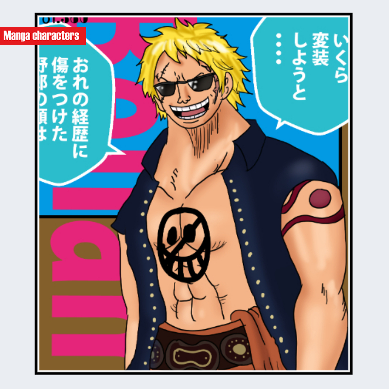 『ONE PIECE』に登場するベラミーは、荒く逆立った金髪と黒いサングラスを組み合わせた上半身露出型の造形を持つ。胸元は大きく開いた濃紺のベスト状衣装で、前面には金色のボタンが縦に配置されている。胸部中央には黒い塗装模様が描かれ、体の中心軸に強い視覚的アクセントを形成する。肩には赤と黒の円環状模様が入り、同作のシャンクス系の肩装飾とは異なる単色強調型のデザインとなっている。全体的に「露出外装型」かつ「塗装アクセント構造」に分類される視覚構造を持つ。