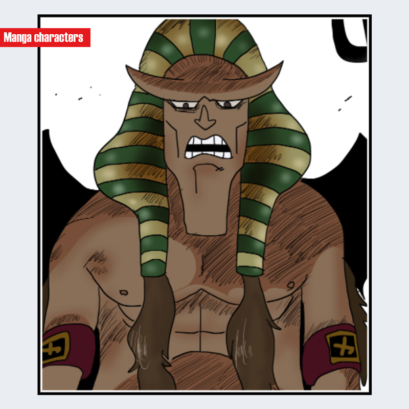 『ONE PIECE』に登場するハンニャバルは、古代エジプト風の頭部装飾と角張った顔の輪郭を特徴とする「象徴外装型」の造形を持つ。頭部には緑と金の縞模様が入った大型のヘッドピースが装着され、肩付近まで大きく垂れ下がる構造となっている。顔は縦長の台形に近い造形で、鼻筋から顎にかけて直線的に落ちる平面構成が強調されている。上半身は裸で、褐色の肌と筋肉の陰影がヘッドピースとの対比を形成し、同作のミノ系獣型キャラとは異なる、人型寄りの記号体系を持つ。