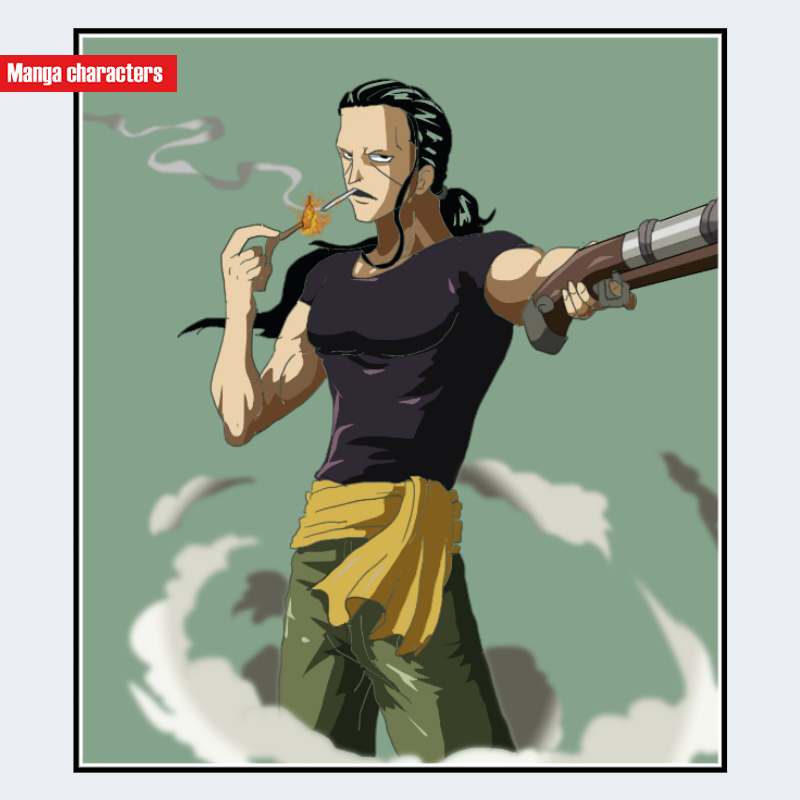 『ONE PIECE』に登場するベン・ベックマンは、長く束ねた黒髪と、身体に沿う濃色のトップスを基調とした「簡潔外装型」の造形を持つ。髪は後方に流れる一束のポニーテール状で、前面には短い房が額に掛かる構造となっている。上半身は筋肉の分割線が強調され、袖口から腕の露出部分にかけて明確な光影が配置されている。腰には黄色系の布が巻かれ、トップスとの色対比がシルエットの境界を形成する。長銃を構える姿が見えるが、視認情報としては髪型・濃色トップス・腰布の三点が主要な外観要素である。