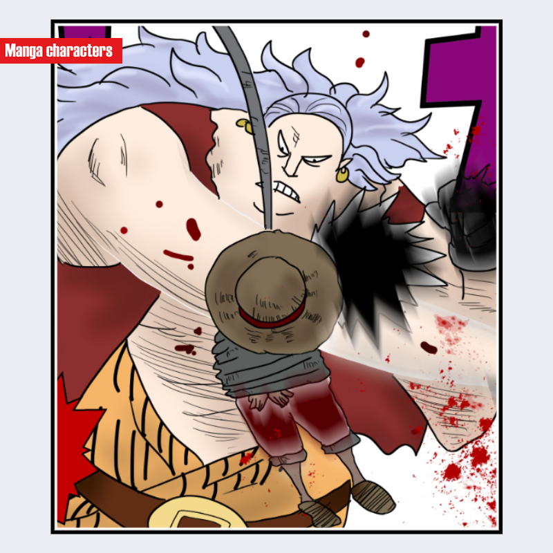 『ONE PIECE』に登場するポルシェーミは、紫系の短髪と、上半身に刻まれた斜め走行の黒いラインが視覚的特徴を構成するキャラクターである。胸部から腹部にかけては肌の露出が大きく、腰には赤系の布状外装が確認できる。肩と上腕には肌色と紫色が切り替わる明確な色分割があり、「分割外装構造」を持つ造形と分類できる。体表には濃淡の影が強く描かれ、輪郭の凹凸がシャープに表れる点で、同作の肩装飾系キャラとは異なる単純化された上半身構造を形成している。