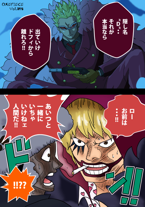 ピンクのハート柄と羽毛マントの組み合わせは一見ファッション系キャラと混同されやすいが、濃色の羽毛外装・前下がり金髪・ピンクシャツの三要素が同時成立する造形はロシナンテ固有である。