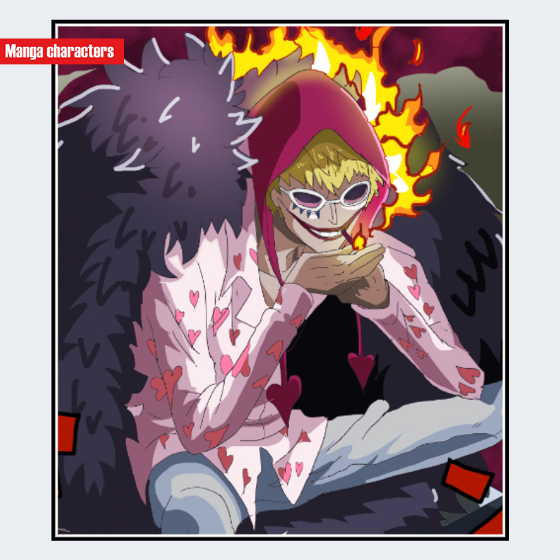『ONE PIECE』に登場するドンキホーテ・ロシナンテ(コラソン)は、金髪を前下がりに覆うフード付き外装と、羽毛のように広がる濃色マントを組み合わせた「外装重層型」の造形を持つ。上半身には淡いピンク色のシャツが確認でき、ハート形の模様が複数散りばめられた分割外装構造となっている。フードは深く被られ、顔の周囲に暗色の影が生まれ、周囲の濃色マントとのコントラストを強調している。手元で火を持つ姿勢が見えるが、視認情報としては羽毛外装・フード・ハート柄シャツが主たる記号となる。
