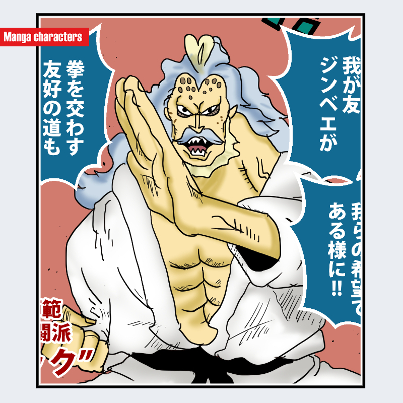 『ONE PIECE』に登場するハックは、青緑色の肌と、長い白髪を頭頂部から後方へ流した特徴的な「擬人化武闘型」の造形を持つ。髪は波打つ形状で肩付近まで伸び、額の生え際は鋭く後退している。上半身はほぼ裸で、胸部と腹部の筋線を強調する陰影が施され、腕部には黄色系の装飾模様が沿うように描かれている。肩からは白い布状の外装が巻かれ、体幹の青緑色との対比により分割外装構造が形成されている。可視範囲では、髪色・体表色・布外装の三点が主要な視覚記号となる。