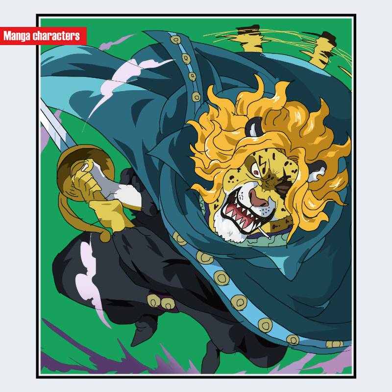 『ONE PIECE』に登場するペドロは、金色の長いタテガミと豹(ジャガー)系の顔つきを併せ持つ「擬獣化構造」のキャラクターである。頭部から肩にかけてタテガミが大きく広がり、毛束は波状で左右に立ち上がるシルエットをつくっている。顔面には黒の斑点が入り、鼻梁から口元にかけて獣型の輪郭が強調されている。上半身は青系のコートを羽織る外装構造で、胸部には黒いインナーが見える分割外装型となっている。片手には武器を保持し、コートの動きと毛並みの広がりが同時に作用する視覚的特徴が確認できる。