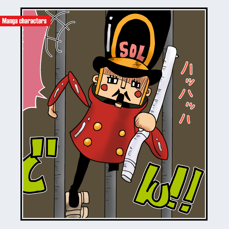 『ONE PIECE』に登場する片足の兵隊は、赤を基調とした玩具兵風の外装と、細長い腕・脚による直線的シルエットが特徴の「玩具擬態型」の造形を持つ。上半身は赤いコート状の外装で、胸部に白いボタンが縦列で配置される分割外装構造となっている。頭部には黒いシルクハット風の帽子をかぶり、下部に装飾的な黄色帯が入る構成で、顔は四角い輪郭とシンプルな目鼻が玩具的記号性を形成する。腕は細く直線的に伸び、脚部も同様に細身で、全体として人形的な均質シルエットが強調されている。