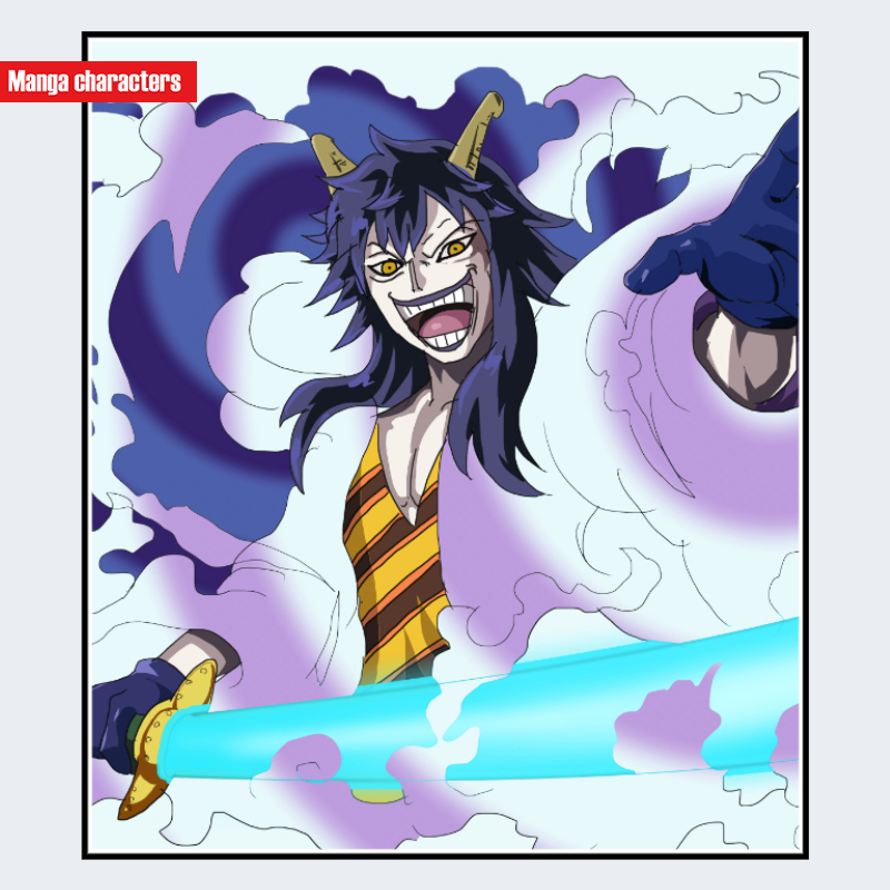 『ONE PIECE』に登場するシーザー・クラウンは、鋭く逆立つ黒髪と、全身を包む紫系の外装をまとった「変形人体型」の造形を持つ。髪は上方向に大きく広がり、不規則な束が複数の尖りを形成している。顔は痩せた輪郭で、口元から頬にかけて黒い線状の陰影が強調され、表情の鋭さを際立たせている。上半身の衣装は白系のコートがふわりと広がる外層構造で、内側には黄色とオレンジの縦ストライプ衣装が分割外装として配置される。周囲には青白い気体状のエフェクトが漂い、外装シルエットと体表の境界を曖昧にする視覚効果を生んでいる。