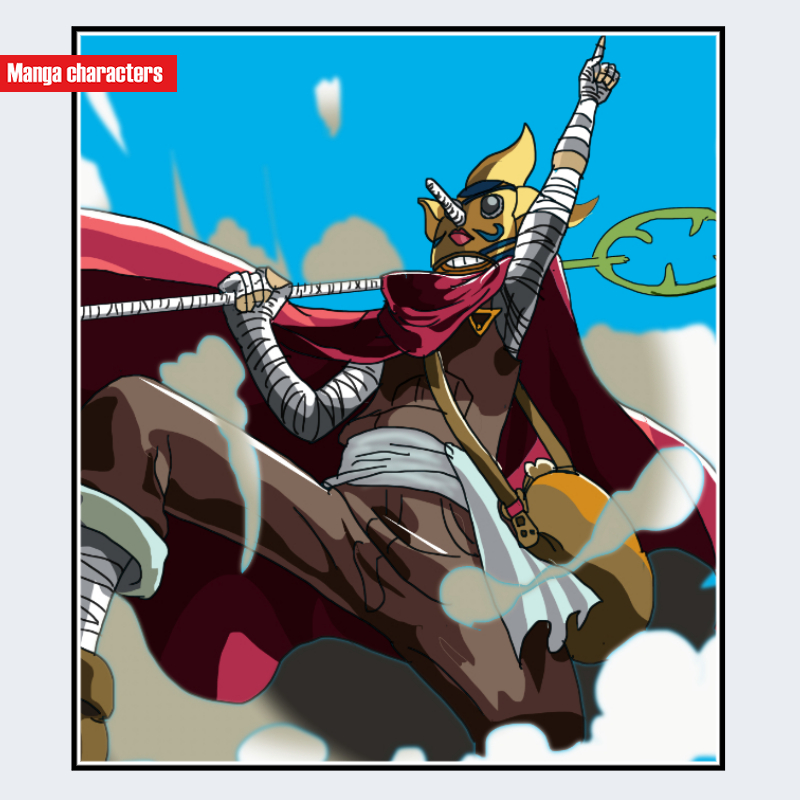 『ONE PIECE』に登場するそげキングは、特徴的な長い鼻のマスクと、赤いマントを組み合わせた「仮装外装型」の造形を持つ。マスクは黄色を基調とし、鼻部分が前方へ鋭く伸びる形状で、上部には赤いゴーグル状パーツが重なる。上半身は包帯を巻いたような外装が腕から肩にかけて連続し、体幹には白い布外装が巻かれる多層構造となっている。背面の赤いマントは大きく広がり、全体のシルエットを縦長に強調する視覚的役割を担う。腰部には濃色の布外装が結ばれており、マント・包帯・マスクの三層で視覚階層が構築されている。