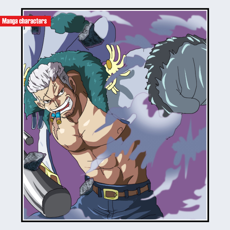 『ONE PIECE』に登場するスモーカーは、短く逆立つ白髪と、上半身を大きく露出させた武闘系の「簡潔外装型」シルエットを持つ。胸部から腹部にかけて筋線が深く刻まれ、体幹の陰影が強調されている。肩には厚手の外装が残り、元のコートの名残となる白い毛皮状の縁取りが可視範囲で確認できる。腕周辺には煙状のエフェクトがまとわりつき、身体の輪郭を部分的に覆う構造を形成する。髪型・露出上半身・肩外装・煙エフェクトの四層が視覚的階層の中心となる。