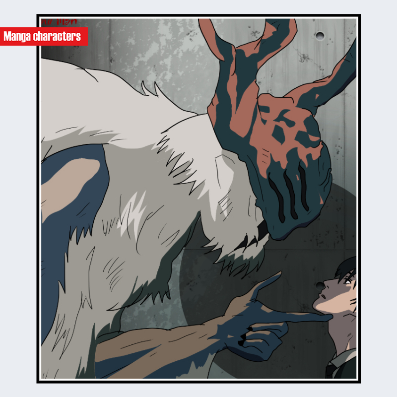 『チェンソーマン』に登場する未来の悪魔は、頭部全体を覆う仮面状の外殻に赤と黒の模様が配置された擬獣化構造のキャラクターである。仮面には縦方向に深い溝が刻まれ、眼孔部分は抽象化された開口構造となっている。上半身には長い白い体毛が密集し、肩から腕にかけてのラインに濃色のパーツが差し込まれている。胴体は細長く、体表の質感が生物的要素と外装的要素の双方を含む混合型デザインになっている。同作内の魔人系キャラと比較すると、生体比率が高く、外殻パーツの面積は頭部に集中している点が特徴である。