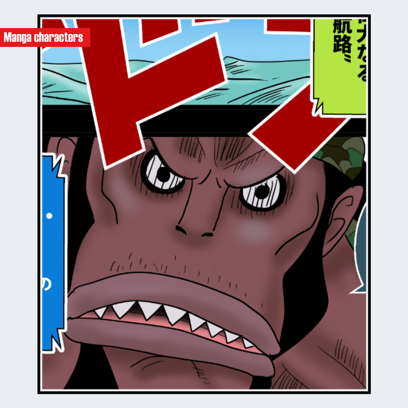 『ONE PIECE』に登場するフィッシャー・タイガーは、強く張り出した頬骨と、縦方向に長い顔の輪郭を特徴とする「擬人化武闘型」の造形を持つ。額から目元にかけては深い影が落ち、瞳の黒い輪郭が強調されている。鼻梁は短く、口元には鋭い三角形状の歯列が並び、体表色は赤褐色の均質な面構造となっている。頭部から側頭部にかけて黒い布外装が巻かれ、上半身の筋線と連続する視覚構造を作っている。可視範囲は顔中心だが、頬骨の張り・歯列・布外装の三要素が主要記号となる。