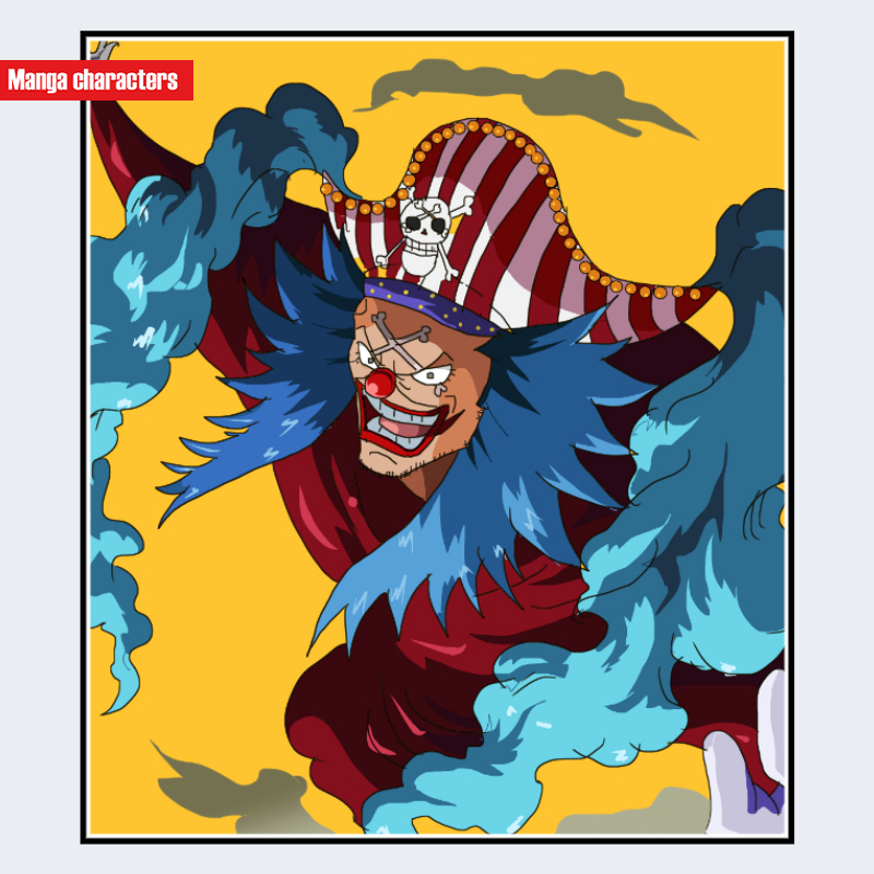 『ONE PIECE』に登場するバギーは、赤白ストライプの大型帽子と青い袖状外装を組み合わせた「仮装外装型」の造形が特徴である。帽子は縦方向の赤白ストライプに金色リベットを打った外装で、前方にはドクロ装飾が配置され視覚記号の中心となっている。顔は赤い丸鼻と濃い青のフェイスペイントが左右へ広がる構造で、髪は青色の長い毛束が左右に散るように伸びる。上半身は赤系の衣装を基調とし、肩から腕にかけては大きく裂けたような青い外装が連なり、シルエットを横方向に広げている。