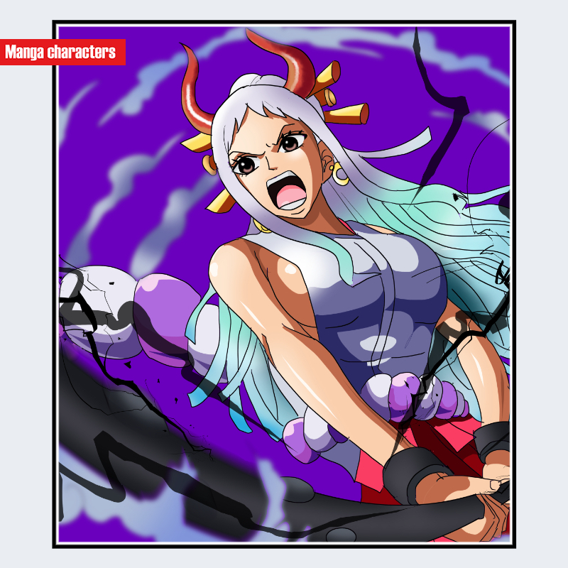 『ONE PIECE』に登場するヤマトは、白から水色へ滑らかに変化する長髪と、先端が赤色の角状パーツを備える「変形人体型」の造形が特徴である。髪は肩口まで大きく広がり、色のグラデーションが視覚中心を形成している。上半身は紫系のトップス外装で構成され、肩周りは露出が多く、外装と肌の境界が明確に区分された分割外装構造となっている。耳元には金色の円形飾りが確認でき、前面から見た際に左右対称の視覚ポイントとして機能する。腕と腰周りには濃い影と補助外装が加わり、色階層による立体感が強調されている。