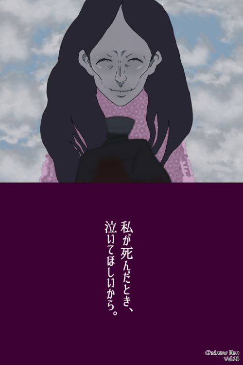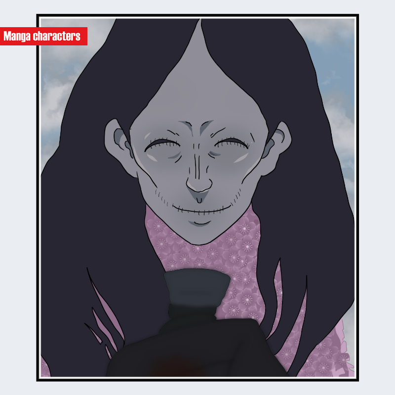 『チェンソーマン』に登場する幽霊の悪魔は、長く下へ流れる黒髪と、細い輪郭線で描かれた顔部構造を持つキャラクターである。目元から頬にかけて深い皺が入り、顔面には肉体的輪郭よりも線的強調が目立つ。衣装は淡色の着物風の上衣で、襟元から胸部にかけて細かな模様が配置されている。体格は細身で、肩から腕へのラインは布地の自然な落下を基調としており、外装的パーツは見られない。擬人化構造を基盤としつつ、顔面の線状強調が他キャラと比べ特徴的である。