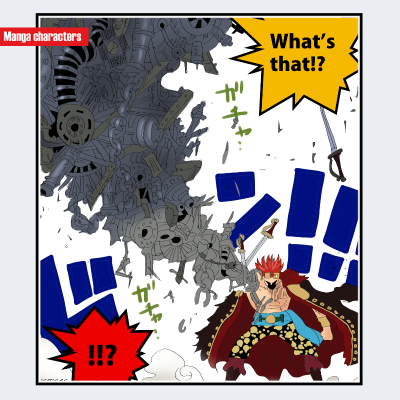 『ONE PIECE』に登場するユースタス・キッドは、赤い逆立った髪型と上半身を覆うメカニカルな巨大腕部構造が強い視覚的特徴となっている。肩から手首に至るまで多数の金属片・歯車・筒状パーツが集合し、外骨格のように外付け化された「機械融合型」構造を形成している。胸元は開放的で、外套は黒系の毛皮装飾を備えた左右非対称のシルエットとなっている。画像では巨大な金属塊が頭上付近に浮遊し、キャラ自身の輪郭よりもメカ構造が画面を占める比率が高い。同作品内ではフランキーの「機械化」構造と比較できるが、キッドは外付けの金属集合体が主であり、身体改造主体ではない点が区別要素となる。