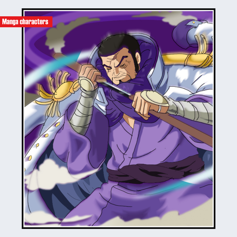 『ONE PIECE』に登場するイッショウ(藤虎)は、濃い紫系の着流しに白い羽織を重ねる「和装融合型」の衣装構造を持つ。肩まわりには厚みのある羽織が掛かり、前面の紫布は襟元から腰帯へ連続する一枚構造でまとめられている。腕には金属製の籠手状パーツが巻かれ、左手には大きな房飾りを備えた杖兼用の刀を保持している。髪型は短く整えられ、口元には特徴的なひげが描かれている。和装系キャラでありながら、金属籠手と大型の房飾りが加わる点が、同作品内の伝統衣装キャラとの視覚的差異を形成する。