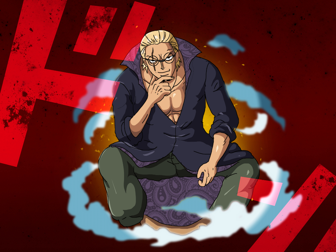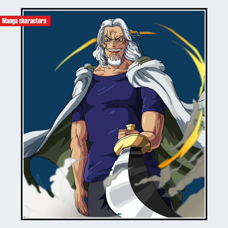 『ONE PIECE』に登場するシルバーズ・レイリーは、白髪のロングヘアと顎ひげを備え、落ち着いた輪郭をもつ頭部造形が特徴である。衣装は深い青紫系のシャツに、白い外套を肩掛けにした「外套融合型」の構造で、外套の裏地には淡い緑系の色味が確認できる。外套は袖を通さず肩に乗せる形で広がり、上半身のシルエットを大きく見せる配置となっている。手元には金色の鍔を持つ長柄武具があり、武具の金属光沢が衣装の落ち着いた色彩との対比を形成している。作品内では、類似の“肩掛け外套”を持つキャラもいるが、白髪ロング+藍紫シャツという組み合わせがレイリー固有の識別点となる。