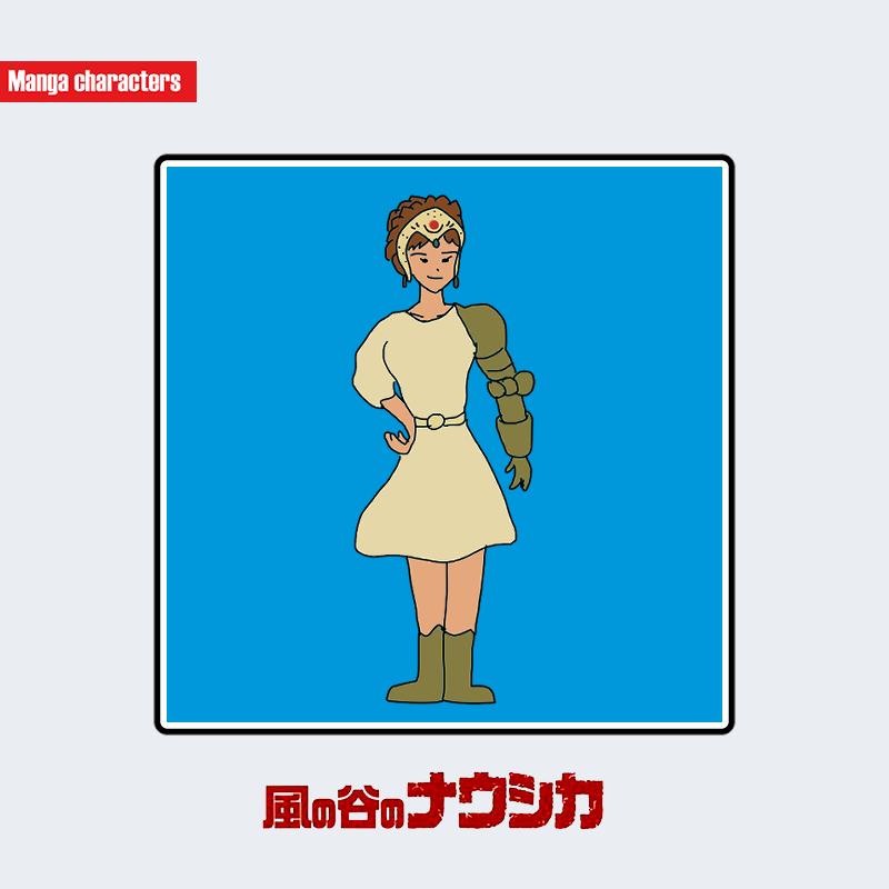 『風の谷のナウシカ』に登場するクシャナは、短い金髪を後ろにまとめ、額には金属製の王冠状ヘッドギアを装着している。衣装は淡いベージュのチュニック型ドレスで、右腕に金属製の義腕装具を備え、左腕との造形対比が際立つ。腰にはベルトが締められ、膝丈の衣装の下にブーツを履いている。全体的に軍装と貴族服の要素を融合した造形であり、構造分類としては「戦装貴族融合型」に該当する。
