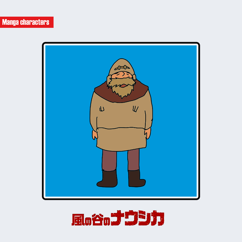 『風の谷のナウシカ』に登場するニガは、厚手のフード付き防寒衣を着用した壮年の男性である。衣装は淡い茶系を基調とし、肩から胸元にかけて濃色の切り替えが施されている。下半身は紫がかったズボンに黒いブーツを合わせ、全体として寒冷地対応の重装構造を持つ。髭を蓄えた顔とゆったりとした衣装ラインが特徴で、構造分類としては「防寒服融合型」に該当する。同作品内の他キャラクターと比較しても、機能性を重視した衣装体系が明確である。