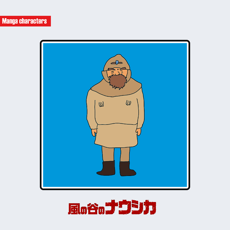『風の谷のナウシカ』に登場するムズは、厚手のフード付きコートを着用した壮年の男性である。衣装は淡いベージュ系を基調とし、襟から胸元にかけて広がる一体構造の防寒装備が特徴的である。ズボンとブーツは濃色でまとめられ、全体として耐候性と保温性を重視した造形が確認できる。頭部は防護帽を兼ねたフードで覆われ、外環境での行動に適応した実用的構成を持つ。構造分類としては「防寒実務型」に該当する。