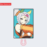 『ウマ娘 プリティーダービー(2018)』に登場するイナリワンは、茶色の髪を高めに結んだツインテールでまとめ、左右の髪飾りが特徴的である。特に片側には狐を模したような仮面状の装飾が付けられており、強い識別点となっている。頭部にはウマ娘特有の耳が確認でき、衣装は紫を基調とした制服型で、白い襟と袖、胸元にはリボンと円形モチーフが配置されている。袖口には折り返しがあり、全体として「制服融合型/擬獣化構造」に分類される。同作品内の他キャラと比較すると、狐面を模した装飾の有無が明確な差異である。