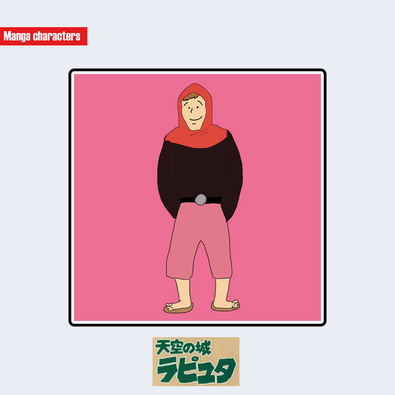 『天空の城ラピュタ』に登場するアンリは、赤い頭巾を深くかぶり、顔まわりをしっかり覆った素朴な装いが特徴的に描かれている。上衣は濃色の長袖で、胴回りがやや丸みを帯びた輪郭を持つ。腰には丸い留め具がついた帯があり、淡い赤系の膝下丈パンツと組み合わされている。足元は簡易的な履物で、全体的に“労働者風・生活衣”の階層構造を示す。構造分類としては「布装束型」に該当し、パズーらの少年作業服とは異なる、成人寄りの落ち着いた衣服構成が視認される。