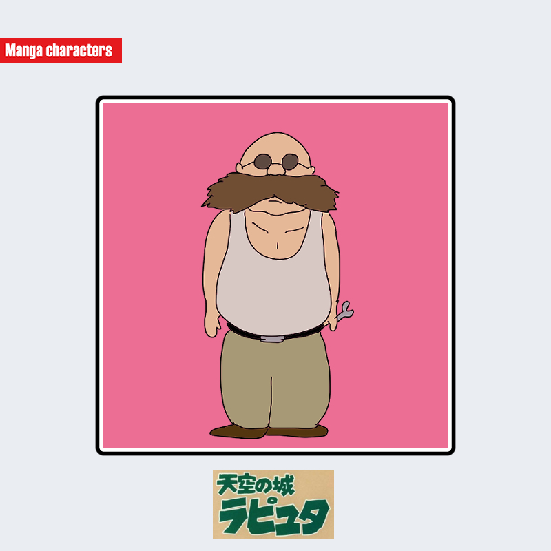 『天空の城ラピュタ』に登場するハラ・モトロは、丸い後退した髪型と大きく横に広がる髭を特徴とする中年男性として描かれている。上衣は袖なしのタンクトップ型で、胸元が大きく開いた形状を取り、腕の可動域が強調される。腰にはベルトと金属バックルを備え、淡い茶系のゆったりしたパンツへとつながる構造を持つ。腹部の丸みがシルエットとして明確で、同作に登場するドーラ一家の布装束系衣装とは異なる“軽作業服”寄りの外観を形成している。構造分類としては「軽作業衣型」に該当する。