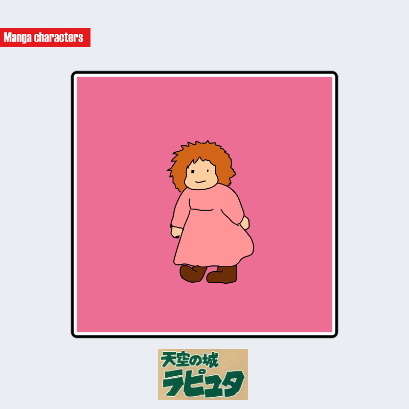 『天空の城ラピュタ』に登場するマッジは、全体にやわらかい丸みを帯びたシルエットが特徴的な幼い少女として描かれている。髪は明るい茶系で大きく広がるカール状のボリュームを持ち、頭部の輪郭に動きを与えている。衣装は淡いピンク色の長袖ワンピースで、袖口や裾が閉じたシンプルな構成となり、子供向けの日常衣に該当する視覚階層を示す。足元は濃色の短いブーツで、丸みのある形状が衣服全体のフォルムと一致する。構造分類としては「子供衣型」に該当する。