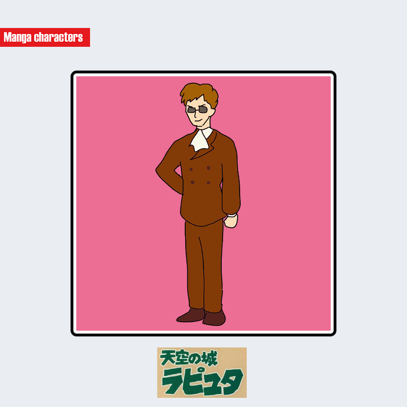 『天空の城ラピュタ』に登場するムスカは、短く整えられた明るい茶系の髪と、細い縁のサングラスをかけた端正な輪郭が特徴である。衣装は濃い茶色のスーツ一式で構成され、上着はダブル風の前合わせと複数ボタン、白いシャツを内側に組み合わせた形式となっている。パンツも同色で統一され、身体全体を細身に見せる直線的なシルエットが形成されている。同作に多い作業衣・布装束のキャラクターとは異なり、形式的で“公的衣装”寄りの視覚階層に属する。構造分類としては「公的制服型」に該当する。