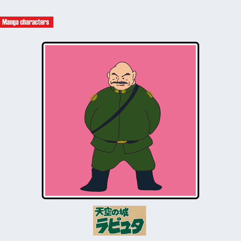 『天空の城ラピュタ』に登場するモウロ将軍は、丸く剃り上げた頭部と左右に広がる口髭を持つ壮年の男性として描かれている。衣装は濃緑色の軍装を基調とし、肩章の金色パーツや斜め掛けのサッシュ状ベルトが階級を示す視覚要素として配置されている。上衣は高い襟を持つジャケット構造で、前合わせは直線的にまとめられ、腰部にはシンプルなバックル付きベルトがある。パンツも同系色で統一され、黒のブーツが下半身を引き締める構成となっている。同作のムスカが“公的制服型”のスーツ構造であったのに対し、こちらは“軍務衣装”としての明確な階層が視認される。構造分類は「軍装型」に該当する。