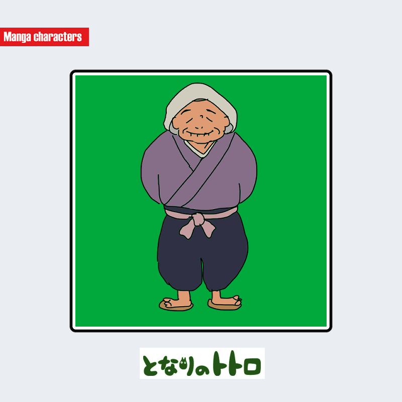 『となりのトトロ』に登場するおばあちゃんは、白髪を布で包むように頭巾状にまとめ、顔まわりに柔らかい輪郭を作る高齢女性として描かれている。上衣は薄紫色の和装風の羽織で、前合わせが斜めに重なる構造となり、淡い桃色の帯で腰を締めている。下半身は濃紺の幅広パンツで、裾がすぼまった形状が視認される。足元は素足に草履風の簡素な履物で構成され、全体的に“農作業・生活衣”寄りの視覚階層に属する衣装である。同作に登場するメイやサツキの洋装とは対照的に、伝統衣服系の構造が明確なキャラクターである。構造分類は「和装生活衣型」に該当する。
