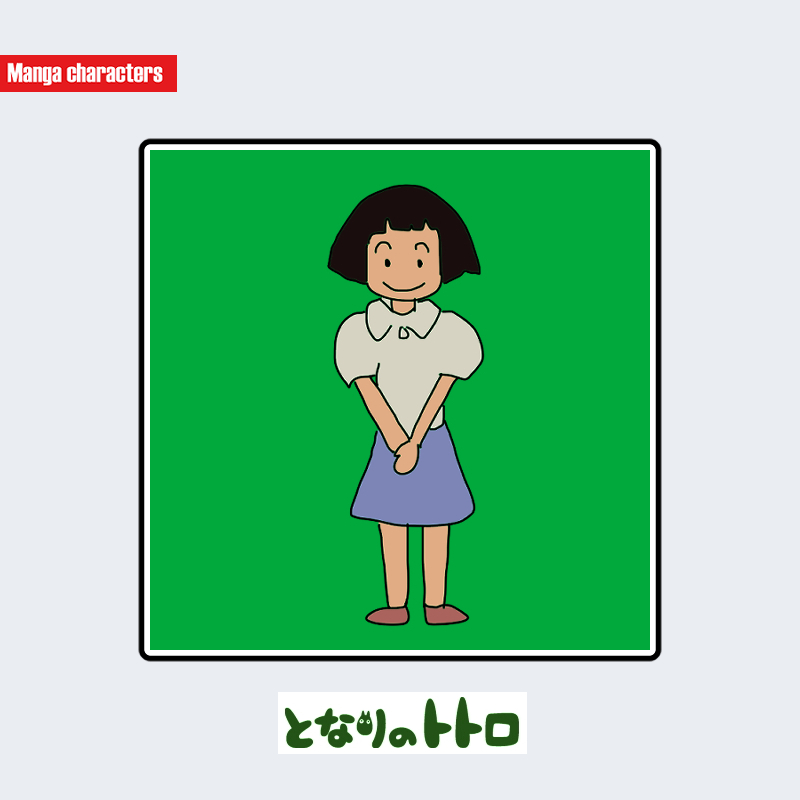 『となりのトトロ』に登場するミチ子は、丸く切り揃えられたおかっぱ髪型と、柔らかい輪郭の表情を持つ少女として描かれている。上半身はクリーム色の半袖ブラウスで、襟元が丸みのある曲線を描くシンプルな前開き構造となっている。下半身は淡い青系の台形スカートで、裾へ向けて緩やかに広がるシルエットが視認される。足元は素足に近い簡素な履物でまとめられ、サツキのサスペンダー付き洋装よりもよりシンプルな“学齢層の日常衣型”として位置づけられる。構造分類は「日常洋装型」に該当する。