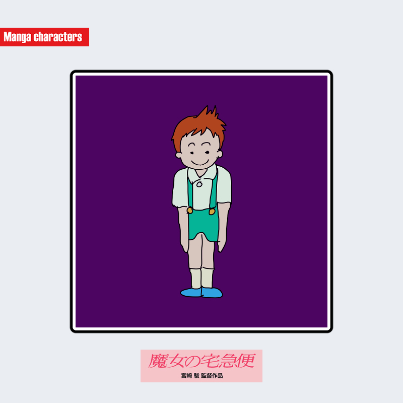 『魔女の宅急便』に登場するケットは、短く跳ねた赤みのある髪型と、淡色シャツに吊り紐付きの短パンを組み合わせた衣装が特徴である。胸元には丸い飾りボタン状のパーツがあり、吊り紐と連動したシンプルな直線構造でまとめられている。足元は青系の靴で統一され、全体として「子ども服系サスペンダー型」に分類される。同作の大人キャラが多く着用する実用衣装とは異なり、年少キャラ特有の軽量で簡潔な衣装階層が視覚的に示されている。