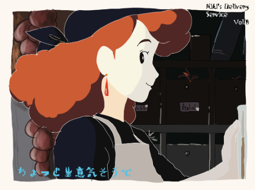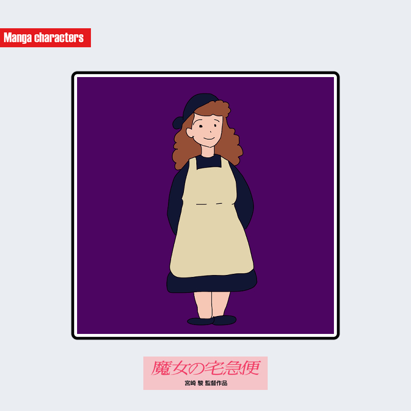 『魔女の宅急便』に登場するコキリは、肩まで伸びたゆるいウェーブ髪と、濃色ワンピースの上に重ねたエプロンが特徴である。頭には同色系の帽子を着用し、全体の配色は暗めのトーンで統一されている。エプロンは前面のみを覆う直線的な形状で、腰のあたりを中心に固定された単純構造になっている。足元は濃色の靴でまとまり、全体として「エプロン装着型」かつ「作業系衣装構造」に分類できる。同作のおソノと同じくエプロンを着用するが、コキリはより落ち着いた濃色ワンピースが基層となっており、衣装階層に差異がある。