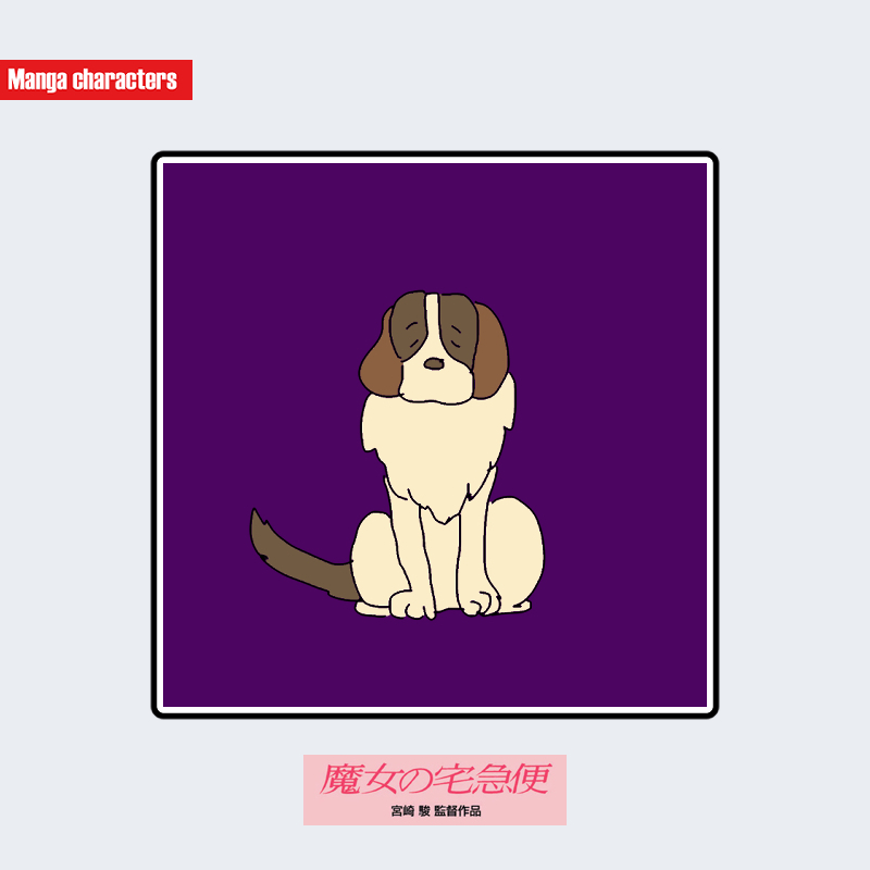 『魔女の宅急便』に登場するジェフは、全身が白と茶の二色で構成された大型犬で、長く下に垂れた耳と、額から鼻にかけての太い茶色のラインが特徴である。胸元から腹部にかけては白い毛並みが広く、四肢は太く丸みを帯びた形状で描かれている。尾は茶色で先端に向かってわずかにカーブしており、体全体の輪郭は柔らかい曲線を基本とする。視覚構造としては「犬型擬獣化構造」に分類され、同作の人間キャラクターとは衣装を持たない点で構造階層が明確に分離している。
