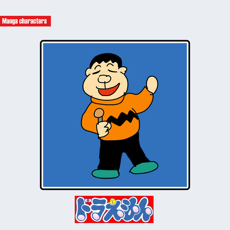 『ドラえもん』に登場するジャイアン(剛田武)は、丸みを帯びた頭部と短い黒髪を持つ擬人化構造のキャラクターである。上衣はオレンジ色の長袖で、胸部には黒いギザギザ模様が水平に配置されている。体格は肩幅が広く、胴体はシンプルな円柱的シルエットで構成されている。手足は太めに描かれ、ズボンは黒色、足元には緑色の靴が確認できる。全体的に直線よりも曲線的な造形が中心で、衣装パターンと体格のバランスが視覚的特徴となっている。