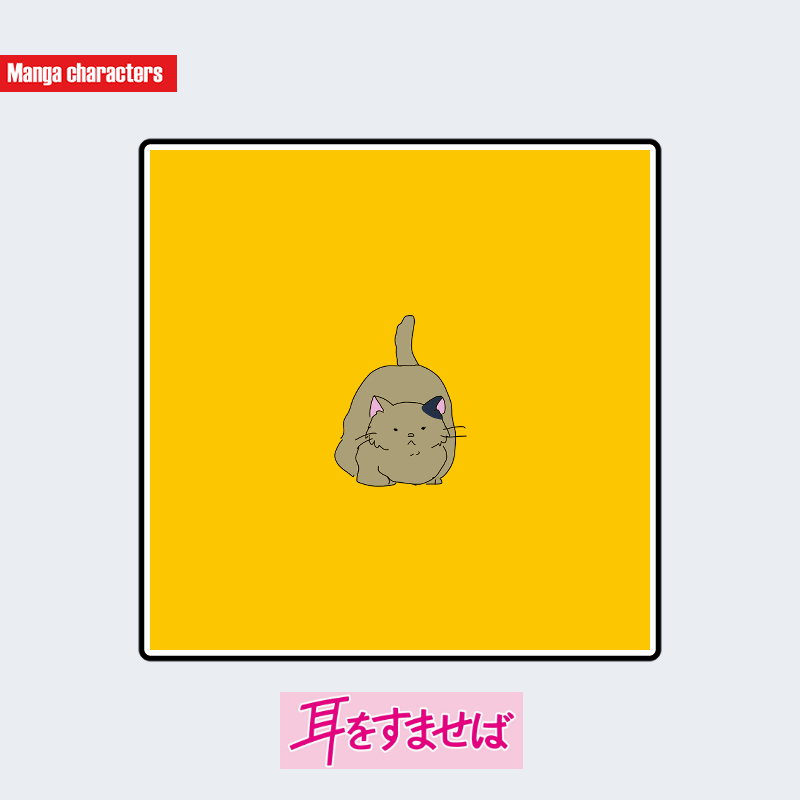 『耳をすませば』に登場するムーンは、丸みの強い体型と短い脚を持つ猫として描かれている。頭部は大きく、左耳側には濃色のパッチ状模様が入り、輪郭の丸さを強調している。尻尾は上方向へ緩やかにカーブし、全体として低重心のシルエットが保たれている。身体の色調は薄いブラウン系で統一され、装飾的要素は排除された簡潔な造形である。こうした特徴から、構造分類は「擬獣化構造」に該当し、人間キャラクターとは異なる動物的シルエットが明確に形成されている。