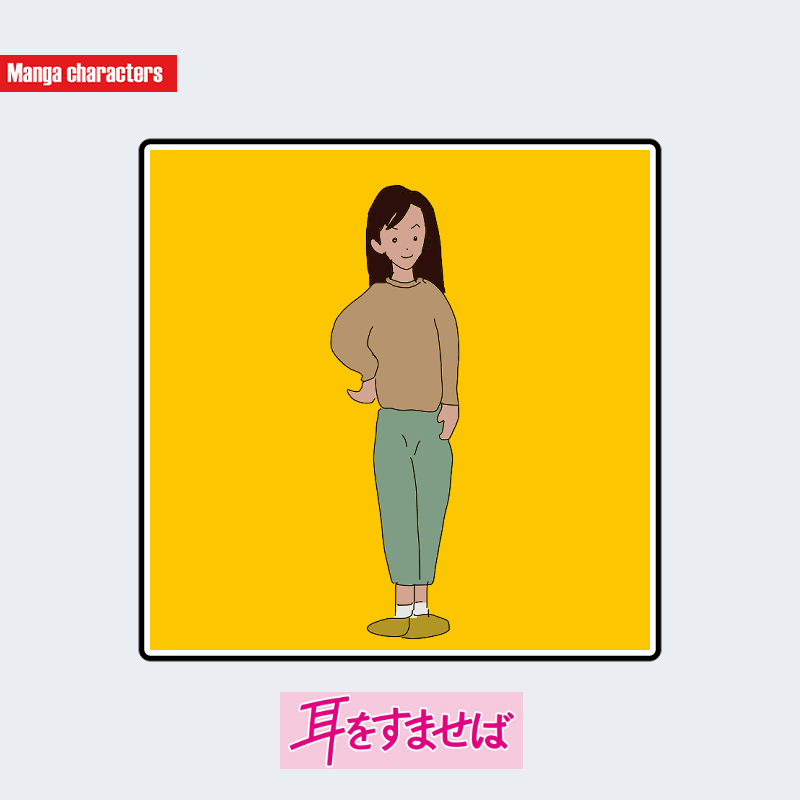『耳をすませば』に登場する月島汐(つきしま しほ)は、肩まで伸びたストレートの髪と、落ち着いた色味のトップスを着用した造形で描かれている。トップスは片側の袖がふくらみを帯びたシルエットとなり、対称性を崩した柔らかな衣装構造が特徴的である。ボトムスは淡い色調のパンツで、裾に向けて細くなる形状が確認できる。全体造形は簡素で装飾パーツを持たず、自然な日常衣服としての統一感が保たれている。構造分類としては「日常衣装型」に該当し、作品内の学制服キャラとは異なるカジュアルな視覚階層に位置づけられる。