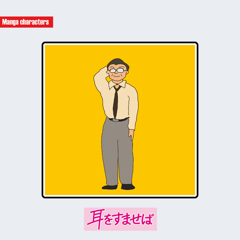 『耳をすませば』に登場する南は、短く整えられた髪型と黒縁の眼鏡を着用した成人男性として描かれている。淡いクリーム色の長袖シャツを着用し、前面にはボタンラインと明確な開襟構造が確認できる。首元には濃色のネクタイが加えられ、胸から腰にかけて縦方向の視覚軸が強調される衣装となっている。ボトムスはグレー系のスラックスで、上衣と対照的に落ち着いた直線シルエットを形成している。こうした特徴から、構造分類は「日常衣装型」に該当し、学生キャラクターとは異なる大人層の視覚階層に位置づけられる。