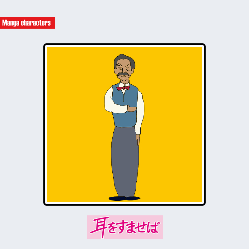 『耳をすませば』に登場する北は、短く整えられた髪型と細い口ひげを特徴とする成人男性として描かれている。上衣は白い長袖シャツを基礎に、青系のニットベストを重ねた明確な層構造が確認できる。首元には赤系ネクタイが差し込まれ、胸元の配色バランスを縦方向に強調している。ボトムスは濃灰色のスラックスで、細身の直線シルエットが全体の重心を下方向へ安定させている。装飾は最小限で、構造分類は「日常衣装型」に位置づけられ、同作品の学生キャラとは明確に異なる大人層の視覚階層を形成する。